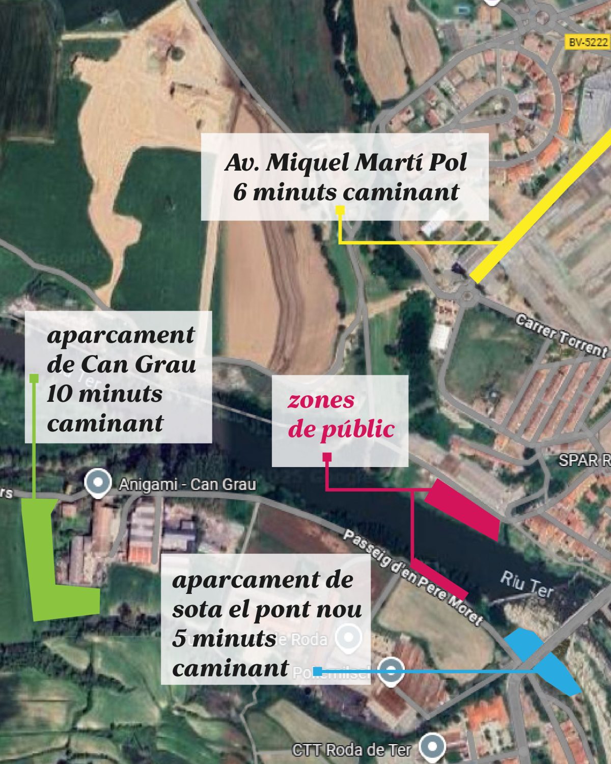 Per tal que tothom pugui gaudir de l’espectacle en bones condicions, s’han habilitat diverses zones senyalitzades per al públic. Es podran seguir les actuacions d'una zona de la banda esquerra del Ter, així com des d’una àrea a tocar del Passeig d’en Pere Moret. Totes aquestes zones es poden consultar al plànol adjunt.